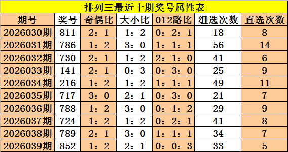 上期回顾:体彩排列三第2026039期奖号:852,奇偶比1:2,大小比2:1,012比0:0:3。