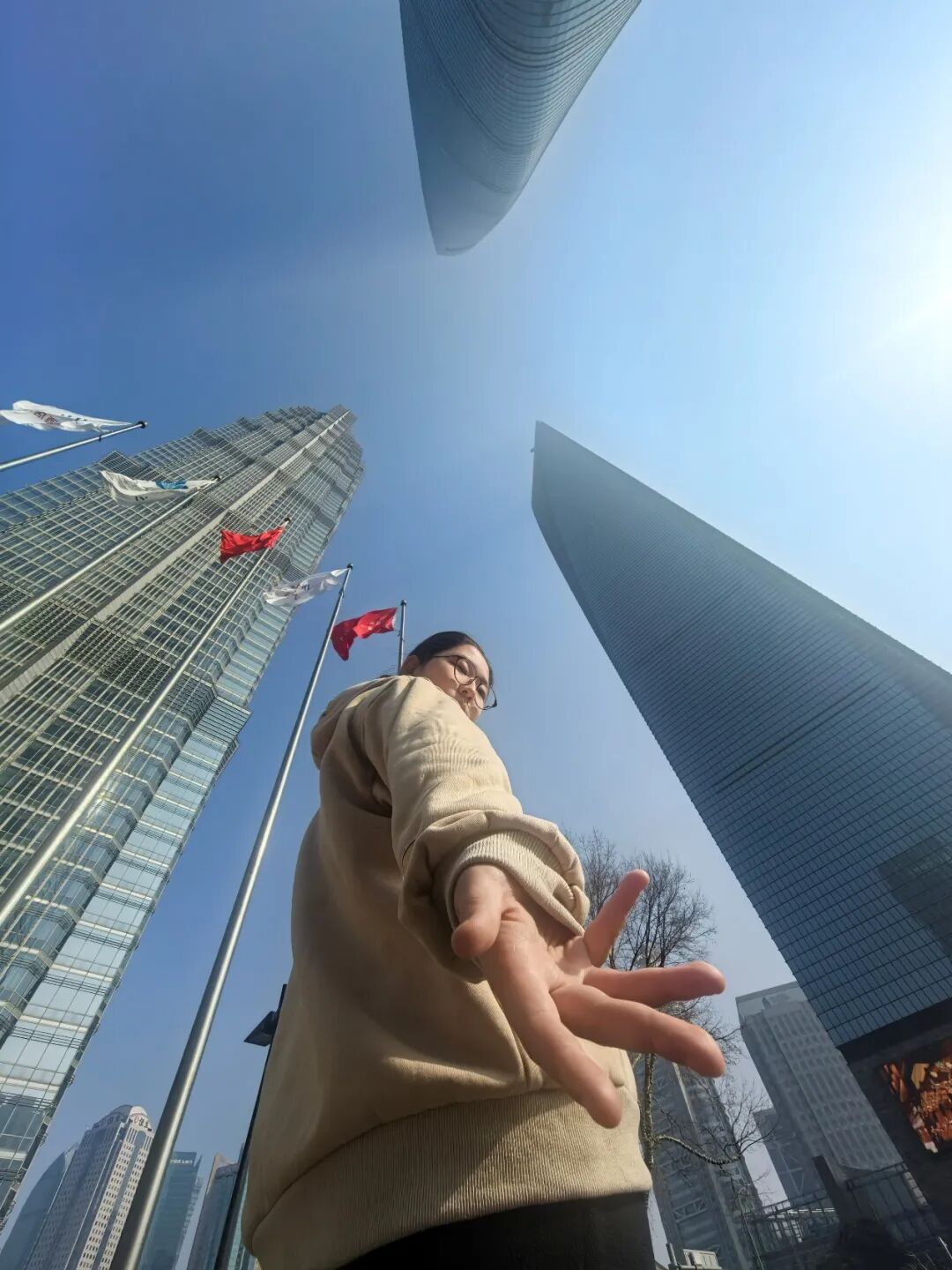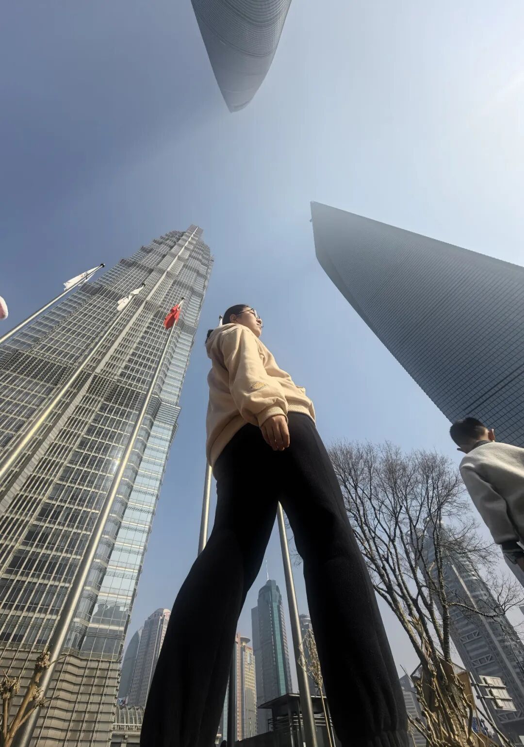 按照付小哥手法拍出的照片,不仅将陆家嘴“三件套”的气势与人物形象完美融合,更轻松将人物拍出“身高2米8”的气场。