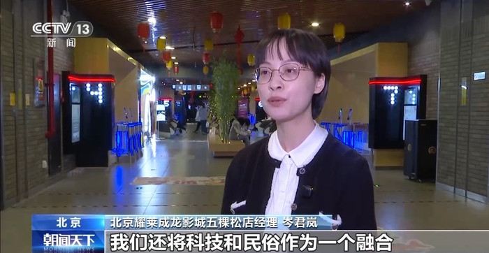 北京耀莱成龙影城五棵松店经理岑君岚:我们还将科技和民俗作为一个融合,人形机器人来到影城跟观众进行互动,通过多元化的活动吸引了非常多的观众。